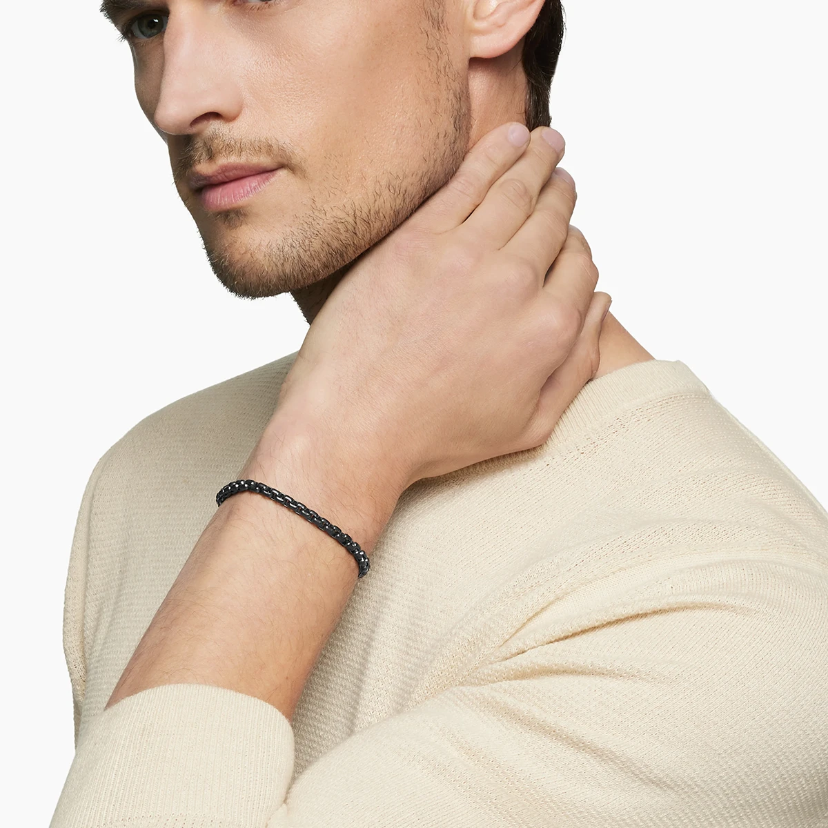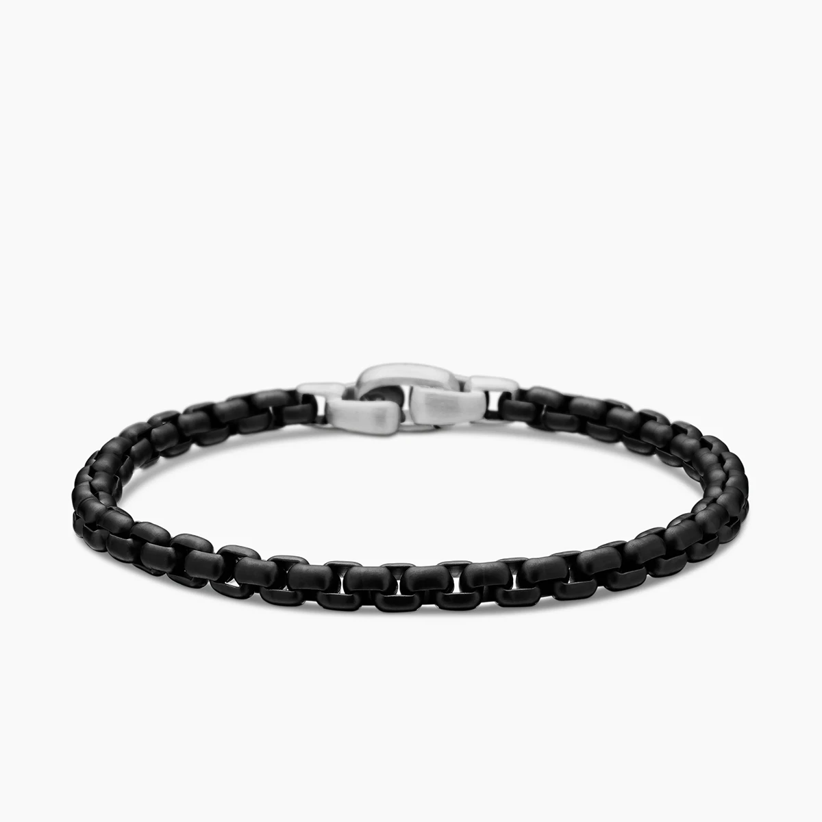 Crafted for the modern man with timeless style, the David Yurman Men's Box Chain Bracelet in black stainless steel (5mm) is a sleek and sophisticated statement of luxury. Meticulously designed with interlocking box links, this bracelet exudes a refined yet bold presence on the wrist. The rich 18K yellow gold construction offers a polished finish that enhances its distinctive elegance, making it perfect for both everyday wear and special occasions. Featuring a secure lobster clasp closure, this piece seamlessly blends strength with style, ensuring a comfortable and secure fit. Whether worn solo for a minimalist touch or layered with other bracelets for a more dynamic look, this David Yurman creation is a testament to craftsmanship and contemporary sophistication. An iconic addition to any collection, this bracelet is ideal for those who appreciate fine jewelry with a modern edge. Size large, retails for $5050